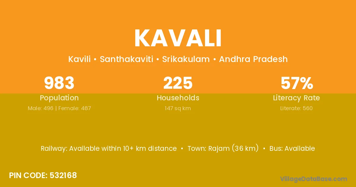 Rajam (36 km) is the nearest town to Kavali village for major economic activities and is located approximately 36 km away.