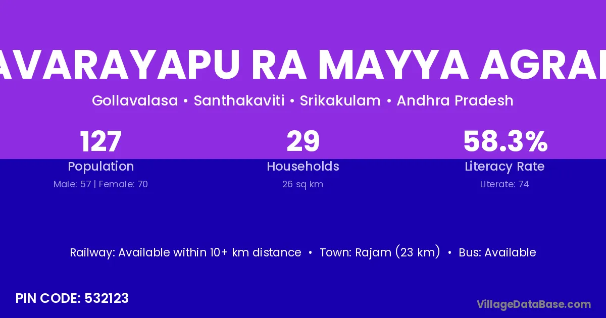 Rajam (23 km) is the nearest town to Madhavarayapu Ra Mayya Agraharam village for major economic activities and is located approximately 23 km away.