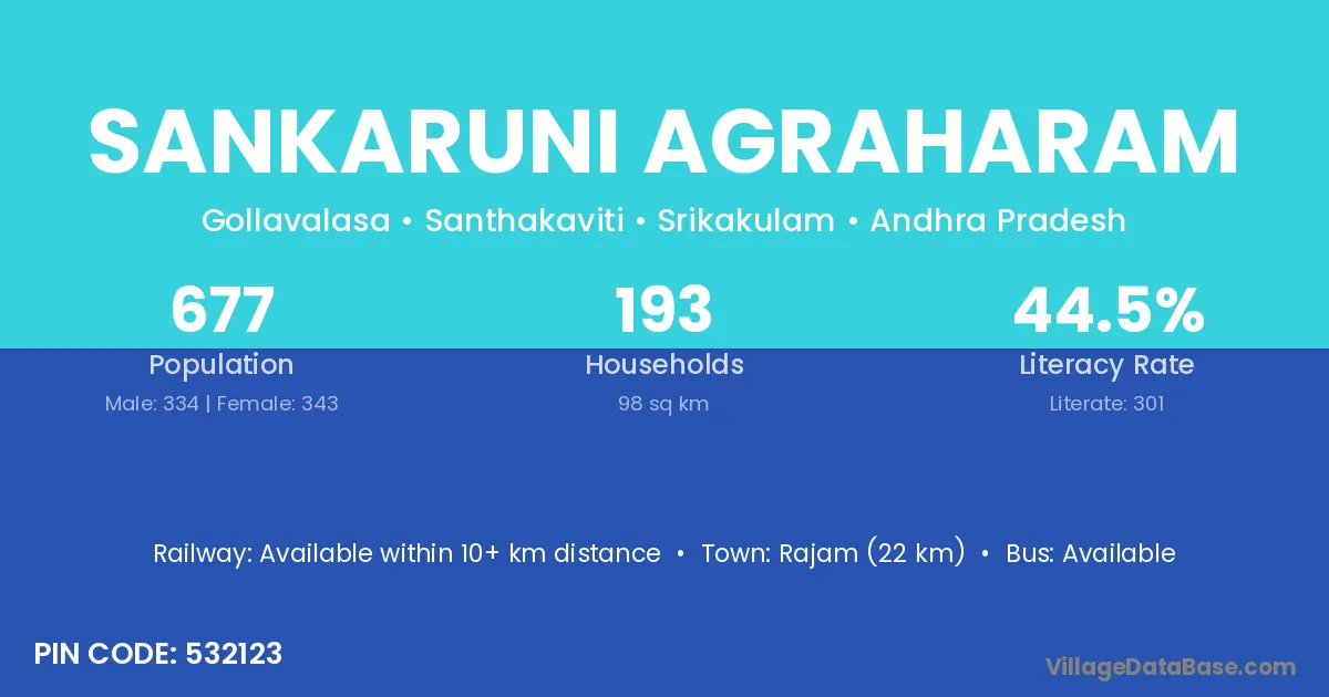 Sankaruni Agraharam village has a total population of 677 people, of which 334 are males and 343 are females.