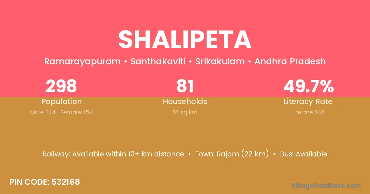 Rajam (22 km) is the nearest town to Shalipeta village for major economic activities and is located approximately 22 km away.