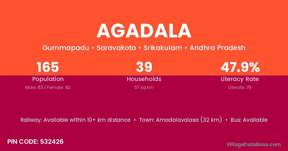 Amadalavalasa (32 km) is the nearest town to Agadala village for major economic activities and is located approximately 32 km away.