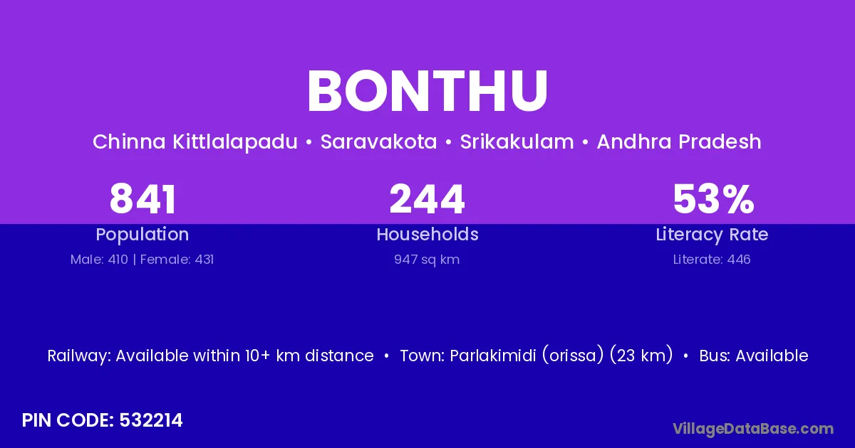 Parlakimidi (orissa) (23 km) is the nearest town to Bonthu village for major economic activities and is located approximately 23 km away.