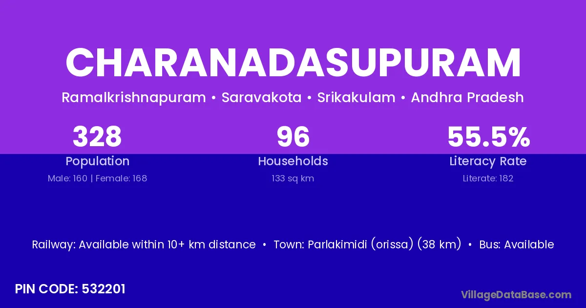 Parlakimidi (orissa) (38 km) is the nearest town to Charanadasupuram village for major economic activities and is located approximately 38 km away.
