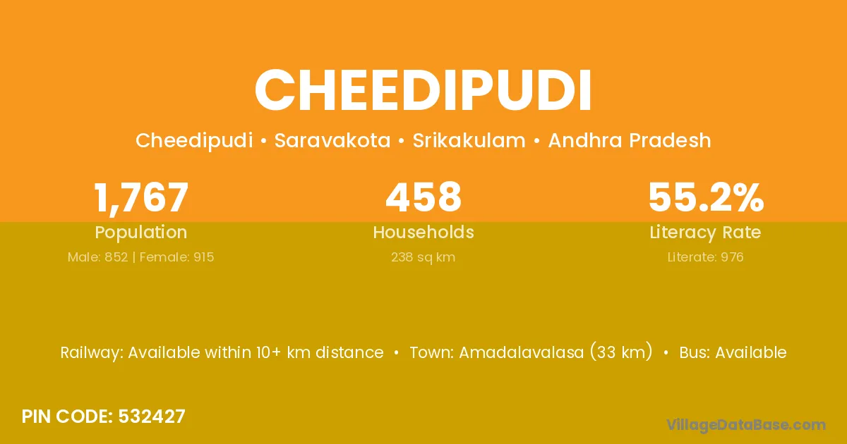 Amadalavalasa (33 km) is the nearest town to Cheedipudi village for major economic activities and is located approximately 33 km away.