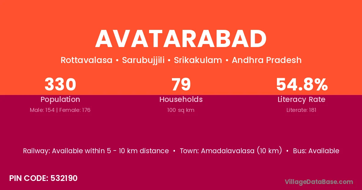 Amadalavalasa (10 km) is the nearest town to Avatarabad village for major economic activities and is located approximately 10 km away.
