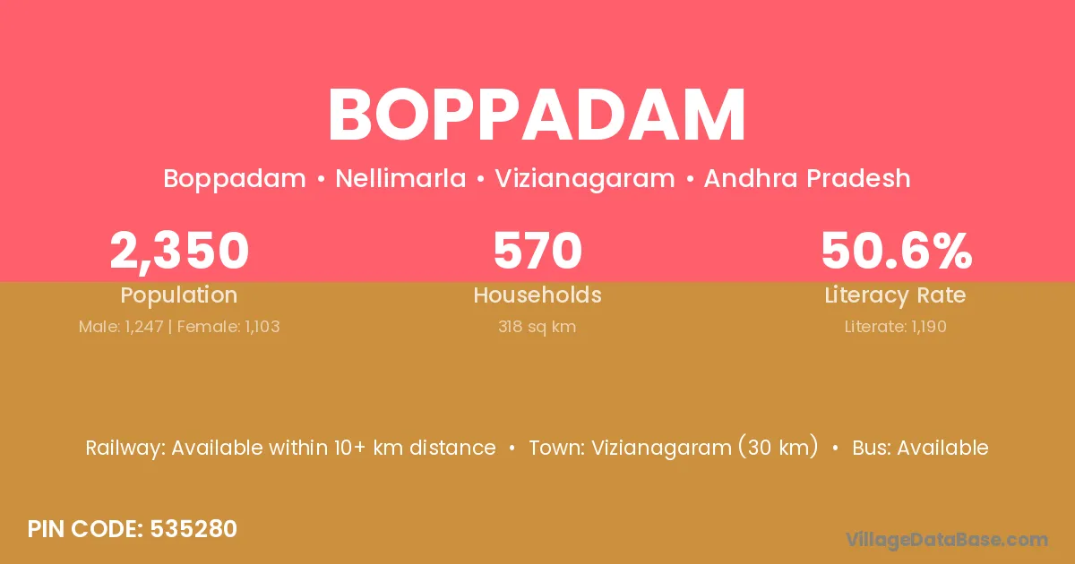 Amadalavalasa (28 km) is the nearest town to Boppadam village for major economic activities and is located approximately 28 km away.