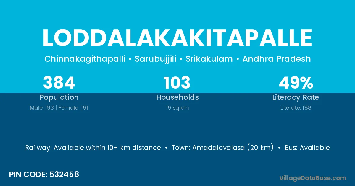 Amadalavalasa (20 km) is the nearest town to Loddalakakitapalle village for major economic activities and is located approximately 20 km away.