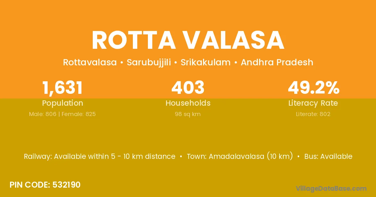 Rotta Valasa village has a total population of 1,631 people, of which 806 are males and 825 are females.