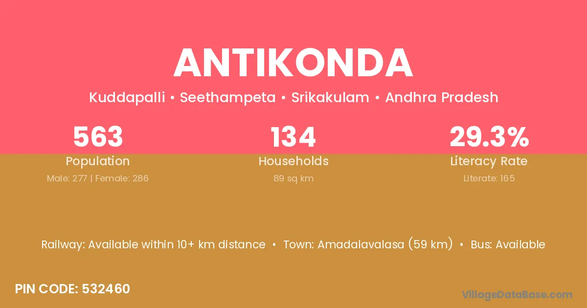 Antikonda village has a total population of 563 people, of which 277 are males and 286 are females.