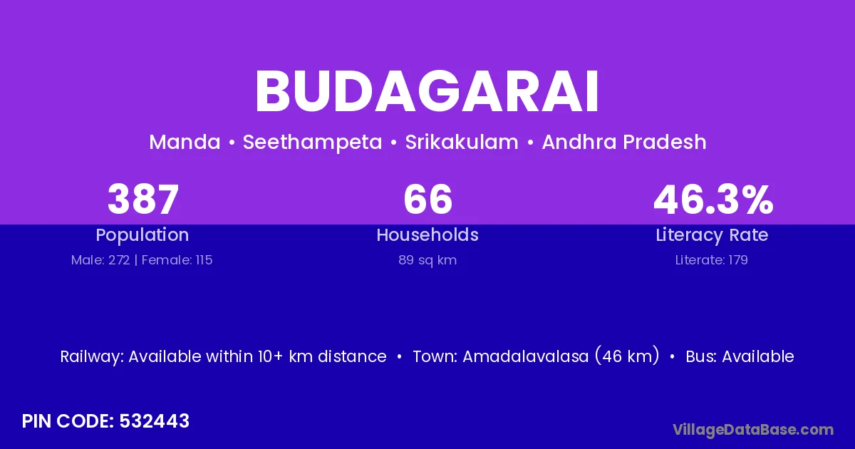 Amadalavalasa (46 km) is the nearest town to Budagarai village for major economic activities and is located approximately 46 km away.