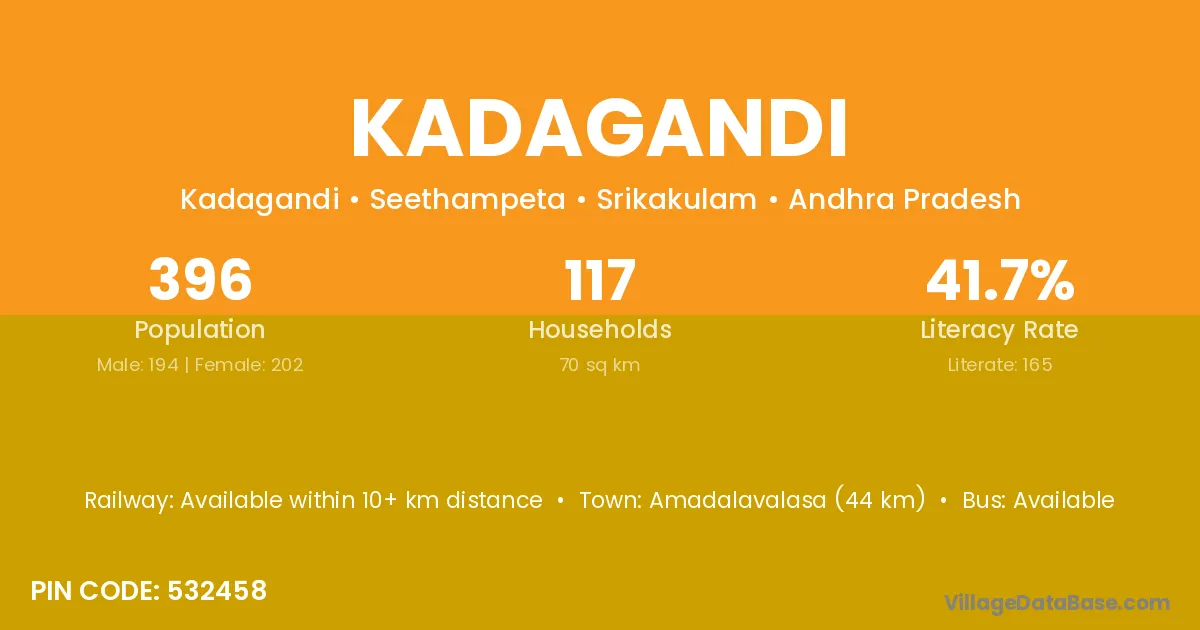Amadalavalasa (44 km) is the nearest town to Kadagandi village for major economic activities and is located approximately 44 km away.