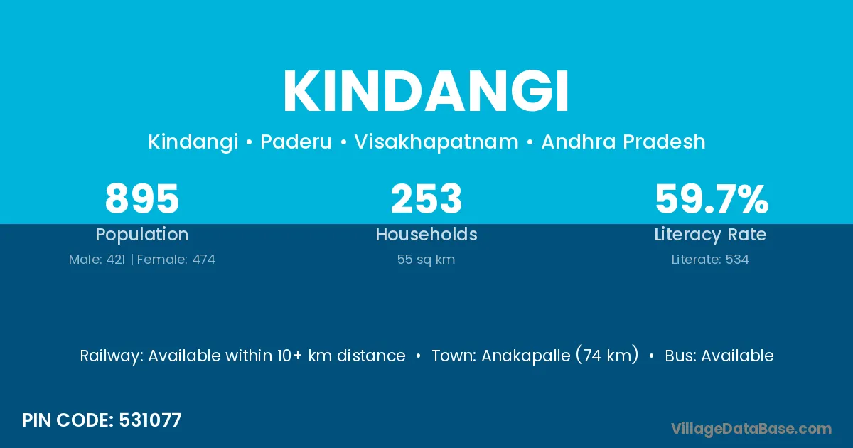 Amadalavalasa (51 km) is the nearest town to Kindangi village for major economic activities and is located approximately 51 km away.