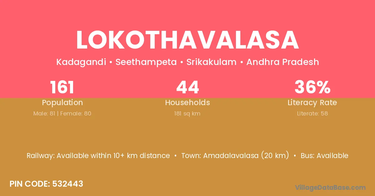 Amadalavalasa (20 km) is the nearest town to Lokothavalasa village for major economic activities and is located approximately 20 km away.