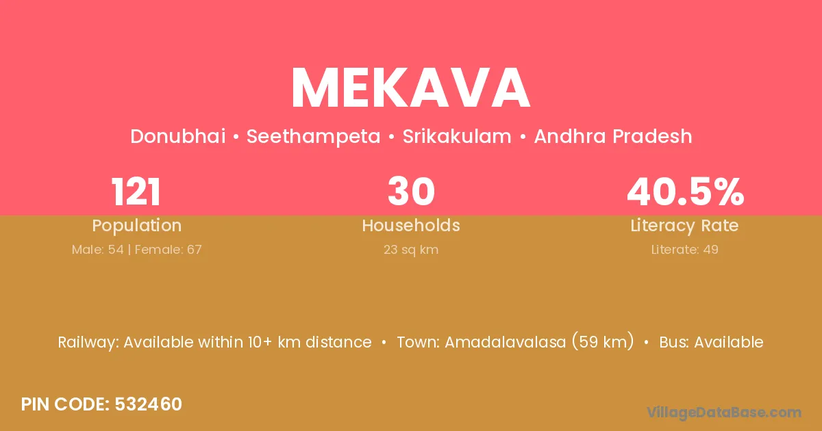 Amadalavalasa (59 km) is the nearest town to Mekava village for major economic activities and is located approximately 59 km away.