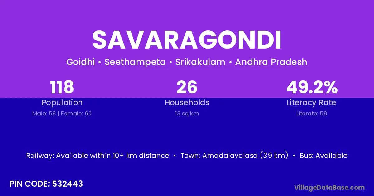 Amadalavalasa (39 km) is the nearest town to Savaragondi village for major economic activities and is located approximately 39 km away.