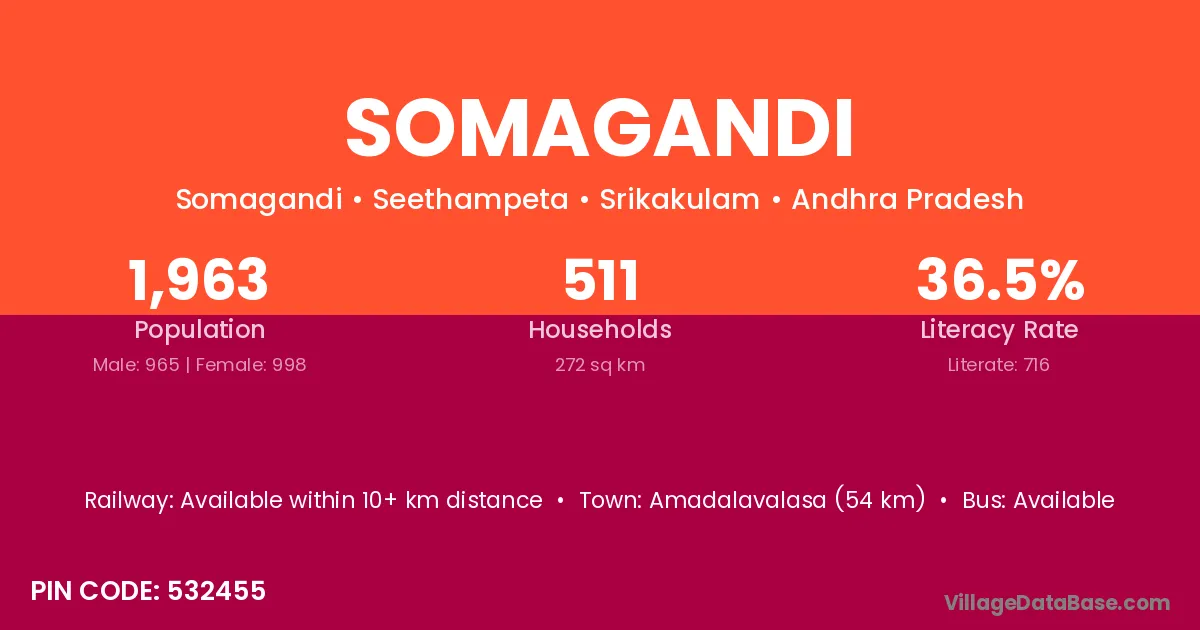 Amadalavalasa (54 km) is the nearest town to Somagandi village for major economic activities and is located approximately 54 km away.