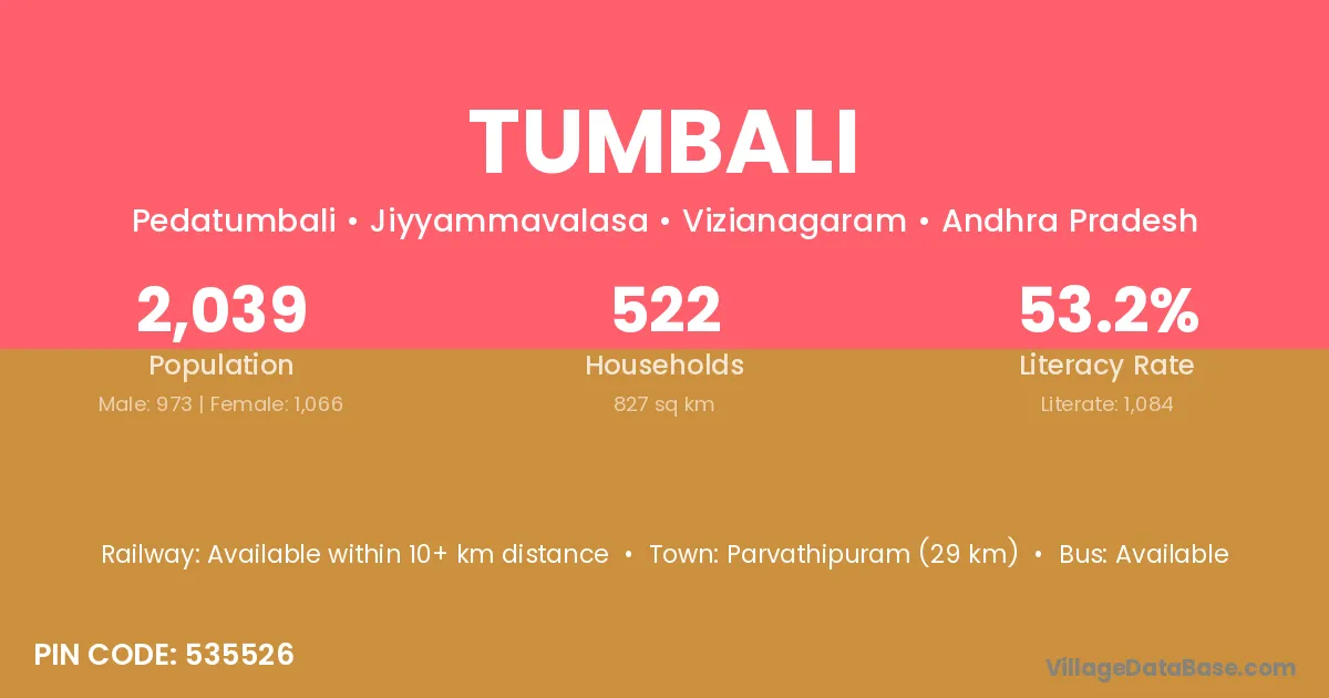 Amadalavalasa (69 km) is the nearest town to Tumbali village for major economic activities and is located approximately 69 km away.