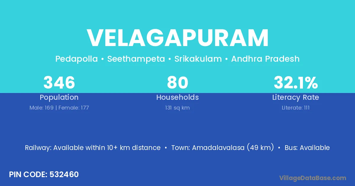 Amadalavalasa (49 km) is the nearest town to Velagapuram village for major economic activities and is located approximately 49 km away.