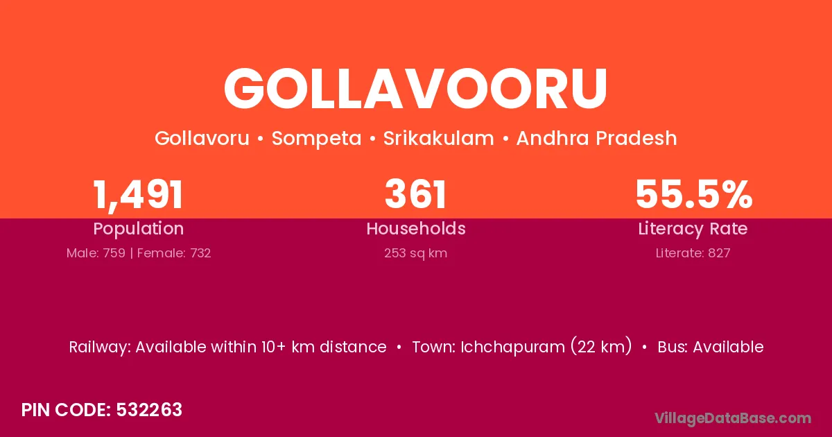 Ichchapuram (22 km) is the nearest town to Gollavooru village for major economic activities and is located approximately 22 km away.