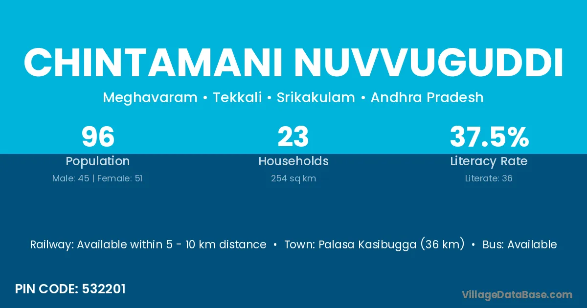 Palasa Kasibugga (36 km) is the nearest town to Chintamani Nuvvuguddi village for major economic activities and is located approximately 36 km away.