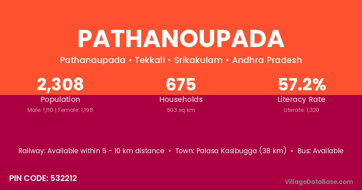 Palasa Kasibugga (38 km) is the nearest town to Pathanoupada village for major economic activities and is located approximately 38 km away.