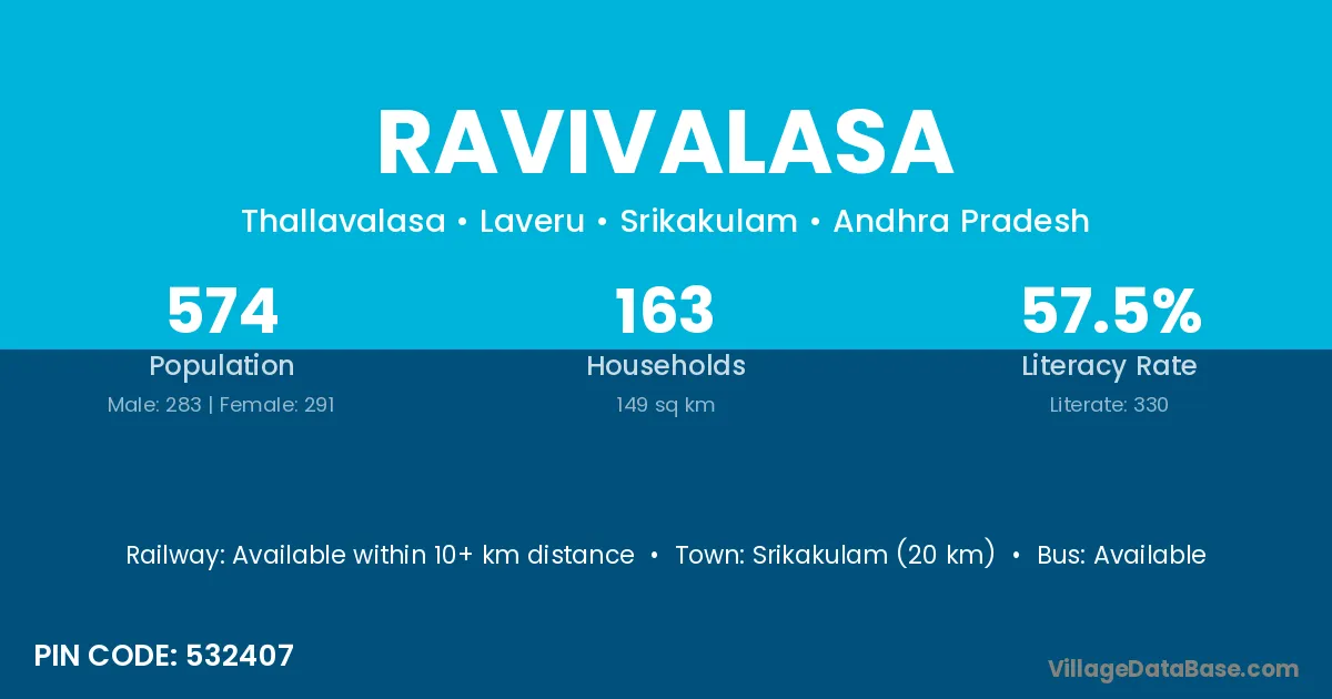 Ravivalasa village has a total population of 3,167 people, of which 1,588 are males and 1,579 are females.