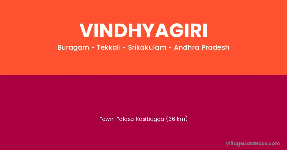 Palasa Kasibugga (36 km) is the nearest town to Vindhyagiri village for major economic activities and is located approximately 36 km away.