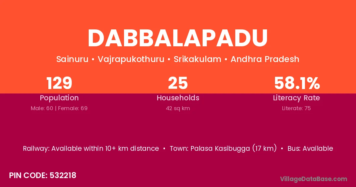Dabbalapadu village has a total population of 129 people, of which 60 are males and 69 are females.