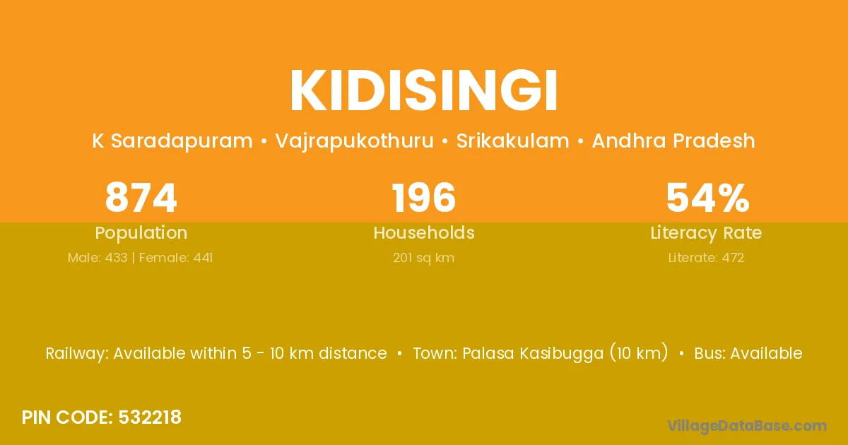 Palasa Kasibugga (10 km) is the nearest town to Kidisingi village for major economic activities and is located approximately 10 km away.