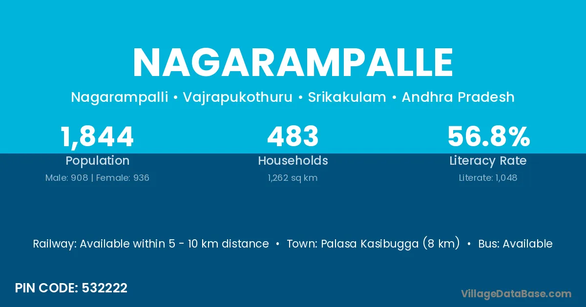 Palasa Kasibugga (8 km) is the nearest town to Nagarampalle village for major economic activities and is located approximately 8 km away.