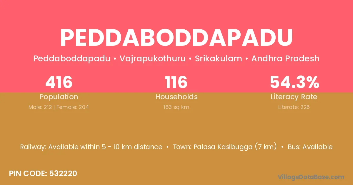 Palasa Kasibugga (7 km) is the nearest town to Peddaboddapadu village for major economic activities and is located approximately 7 km away.