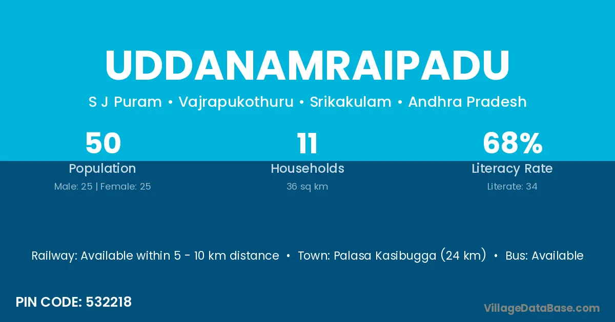 Palasa Kasibugga (24 km) is the nearest town to Uddanamraipadu village for major economic activities and is located approximately 24 km away.