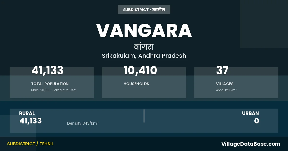 According to the 2011 census The total area of Vangara Mandal is 120 km², with a population of 41133 people. The population density is 343 inhabitants per square kilometre, and there are approximately 10410 houses in the sub district.