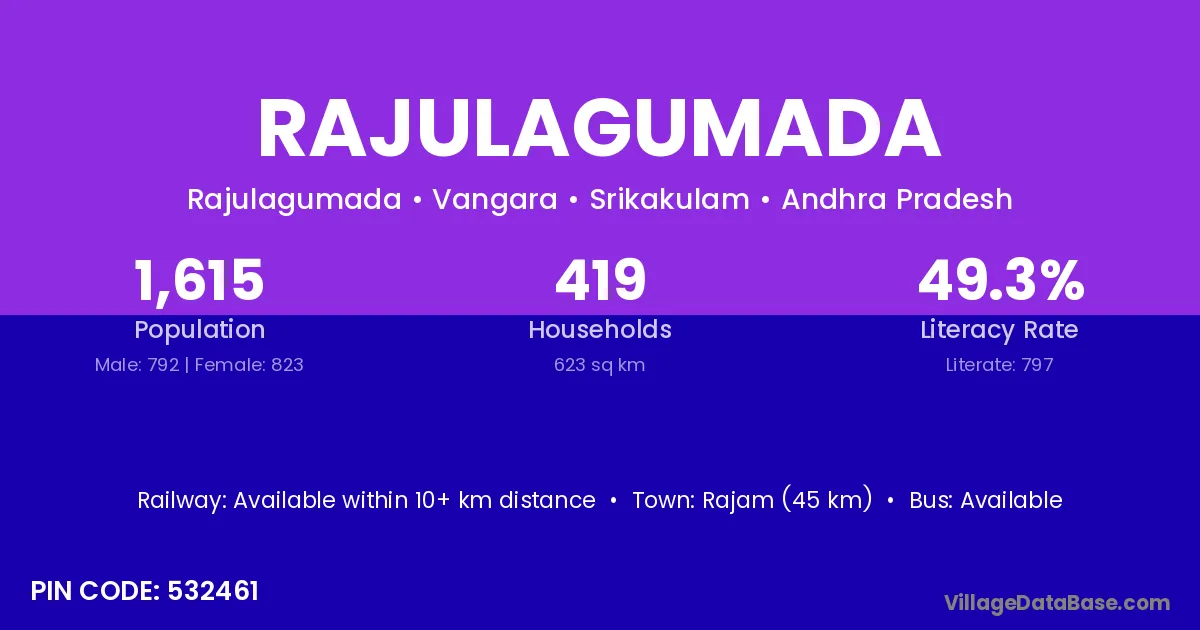 Rajam (45 km) is the nearest town to Rajulagumada village for major economic activities and is located approximately 45 km away.