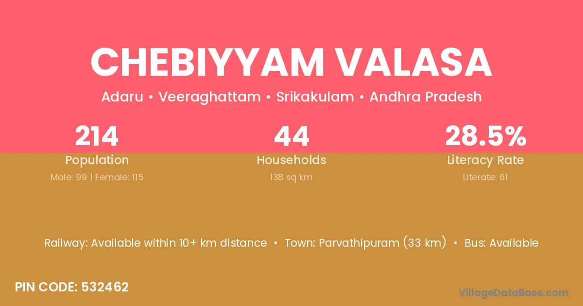 Chebiyyam Valasa village has a total population of 214 people, of which 99 are males and 115 are females.