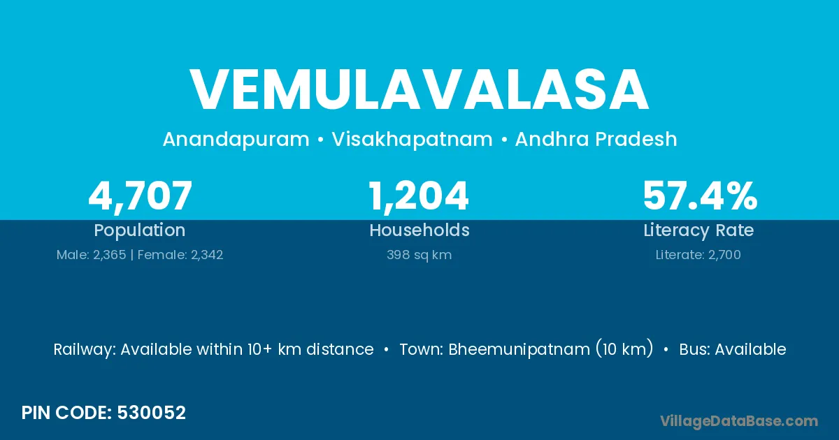 Vemulavalasa village has a total population of 4,707 people, of which 2,365 are males and 2,342 are females.