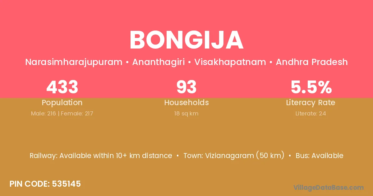 Vizianagaram (50 km) is the nearest town to Bongija village for major economic activities and is located approximately 50 km away.