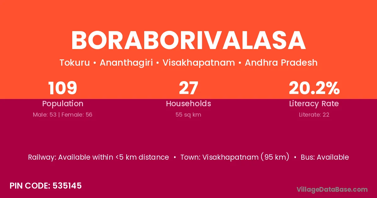 Boraborivalasa village has a total population of 109 people, of which 53 are males and 56 are females.