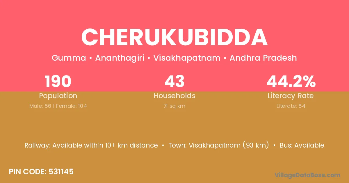 Cherukubidda village has a total population of 190 people, of which 86 are males and 104 are females.