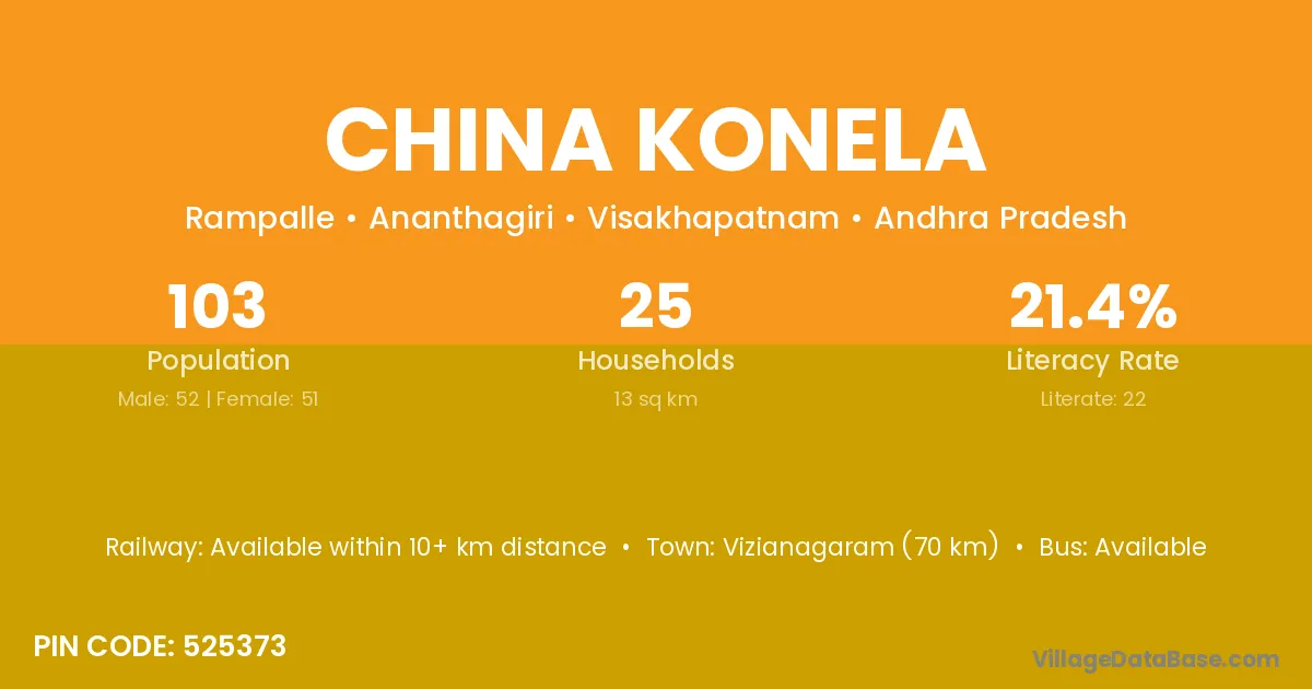 Vizianagaram (70 km) is the nearest town to China Konela village for major economic activities and is located approximately 70 km away.