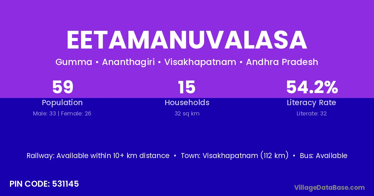 Eetamanuvalasa village has a total population of 59 people, of which 33 are males and 26 are females.