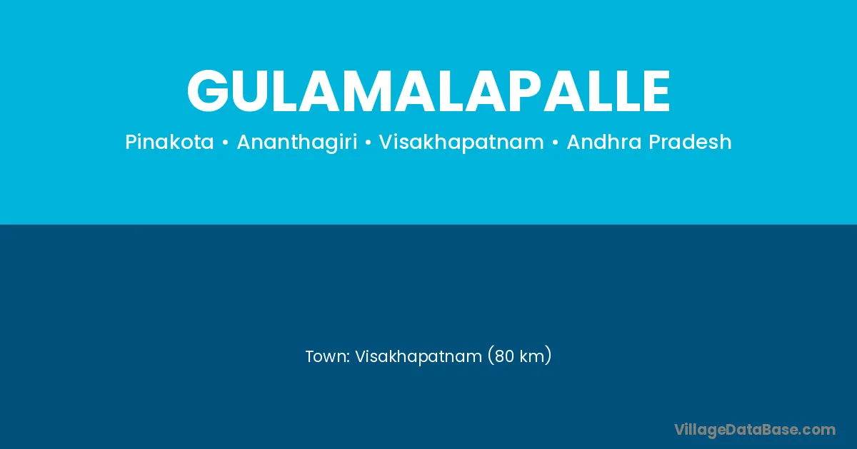 Visakhapatnam (80 km) is the nearest town to Gulamalapalle village for major economic activities and is located approximately 80 km away.