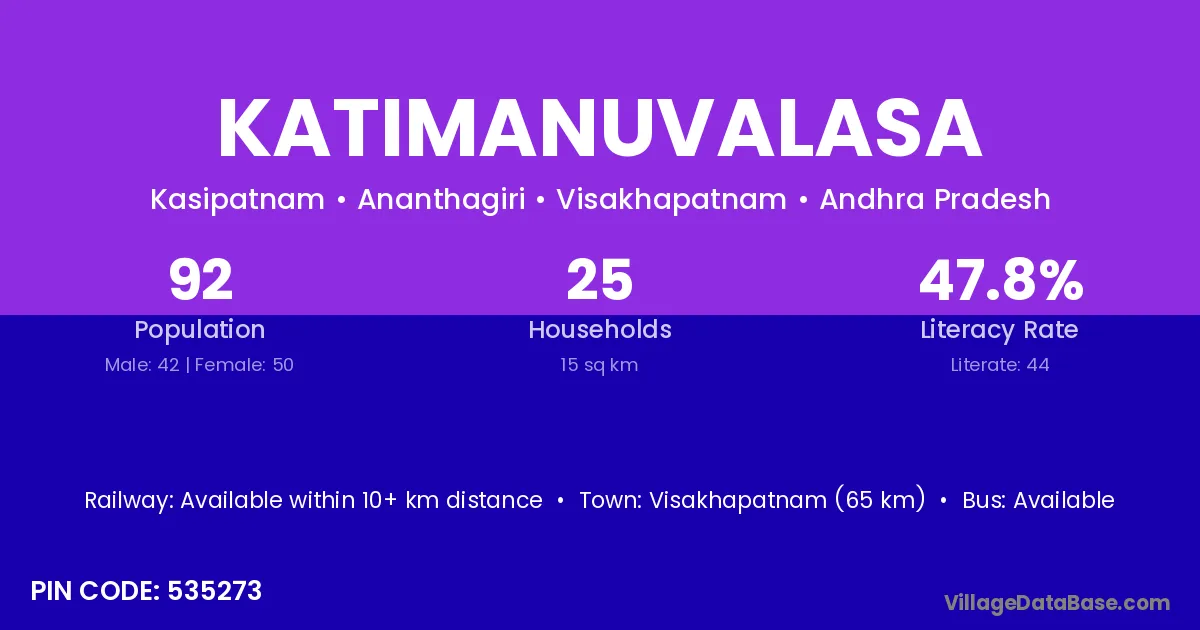 Katimanuvalasa village has a total population of 92 people, of which 42 are males and 50 are females.