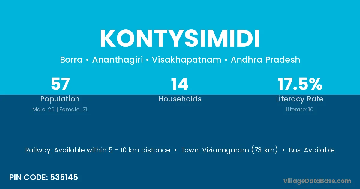 Vizianagaram (73 km) is the nearest town to Kontysimidi village for major economic activities and is located approximately 73 km away.