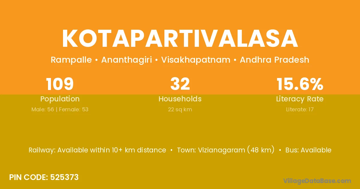 Kotapartivalasa village has a total population of 109 people, of which 56 are males and 53 are females.