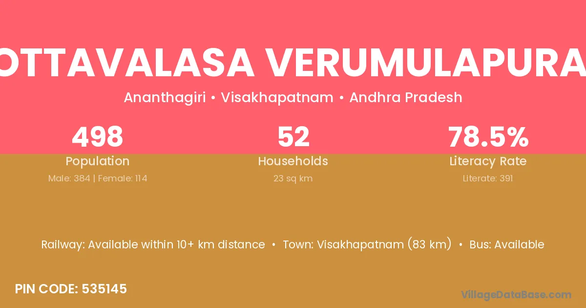 Kottavalasa Verumulapuram village has a total population of 498 people, of which 384 are males and 114 are females.