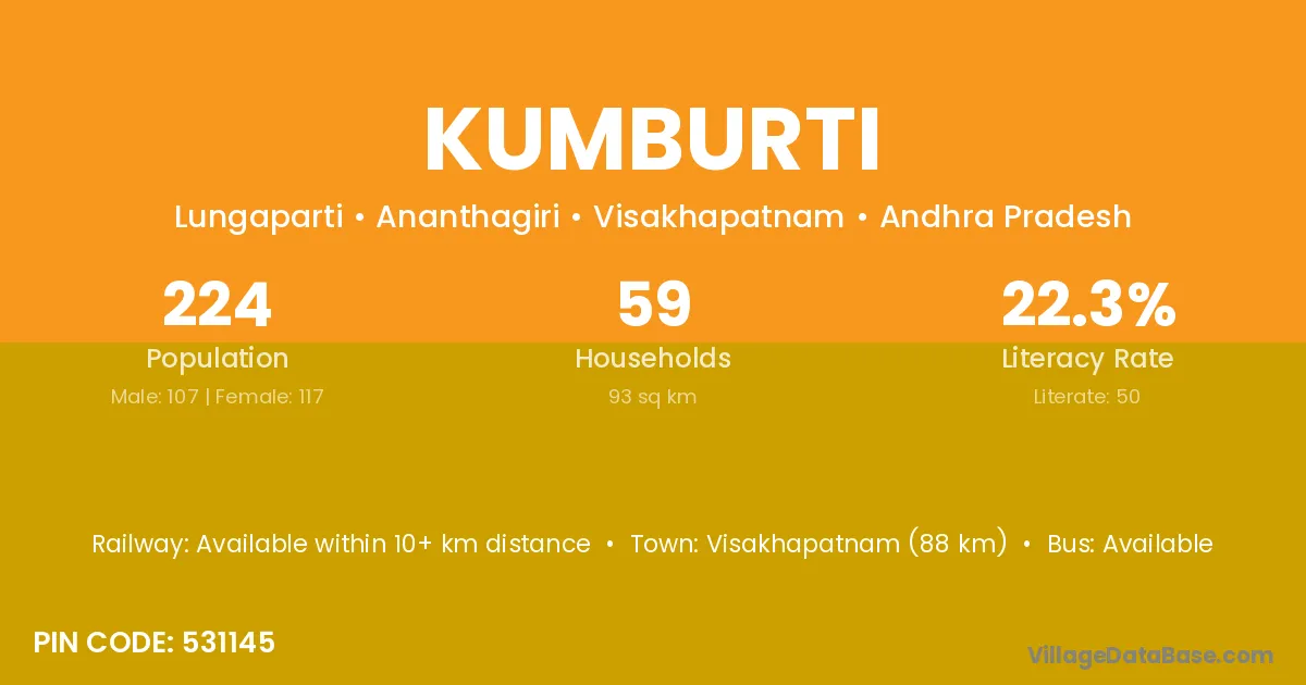 Visakhapatnam (88 km) is the nearest town to Kumburti village for major economic activities and is located approximately 88 km away.