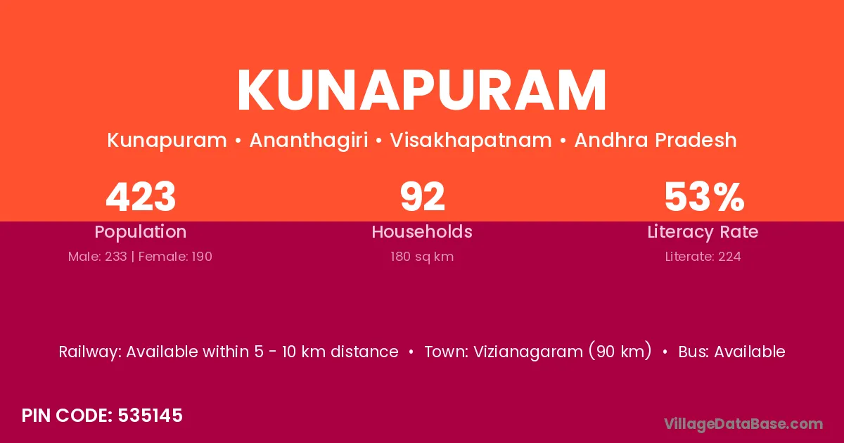 Kunapuram village has a total population of 423 people, of which 233 are males and 190 are females.