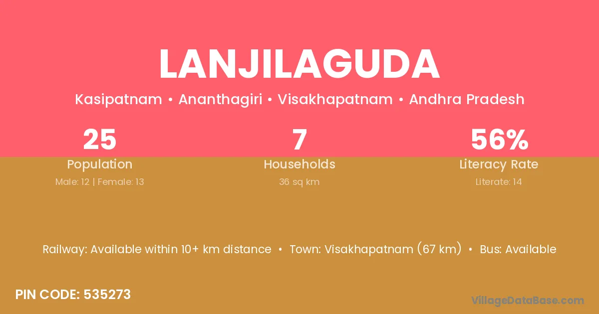 Lanjilaguda village has a total population of 25 people, of which 12 are males and 13 are females.