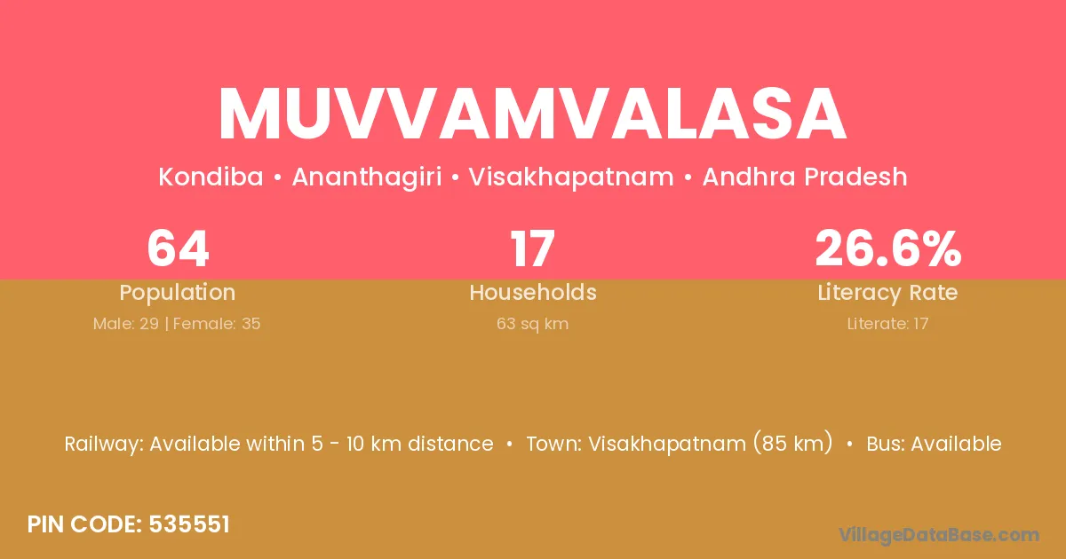 Muvvamvalasa village has a total population of 64 people, of which 29 are males and 35 are females.